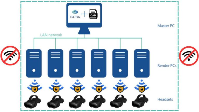 TechViz’s distinctive architecture enables its clients to seclude themselves from the external world, thereby creating a leakage-free VR collaboration environment. This level of security is made possible thanks to a 100% on-premises model, where all necessary components are readily accessible. Wi-Fi serves solely as a substitute for cables.